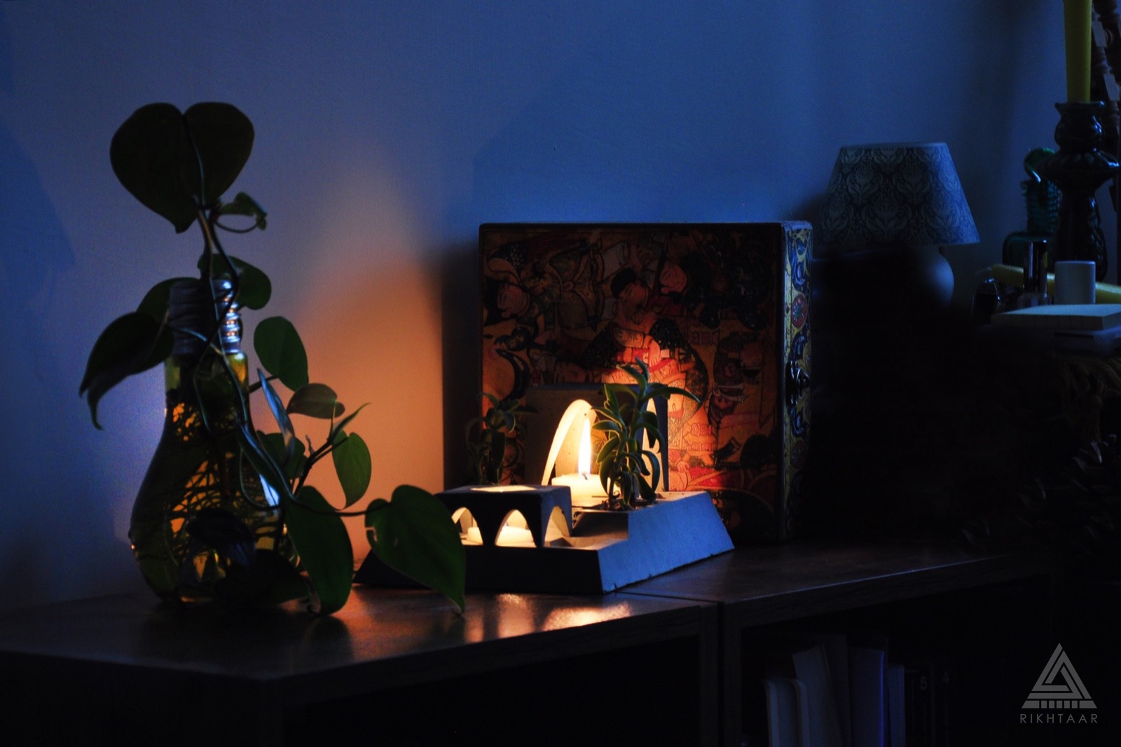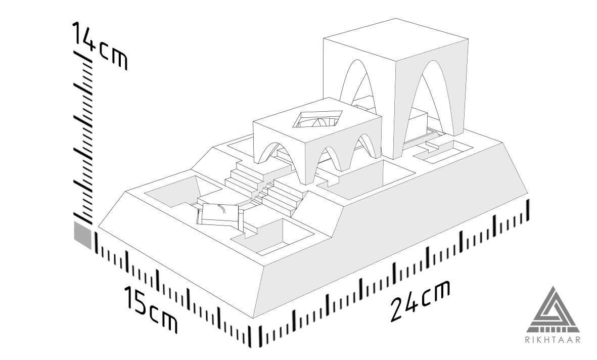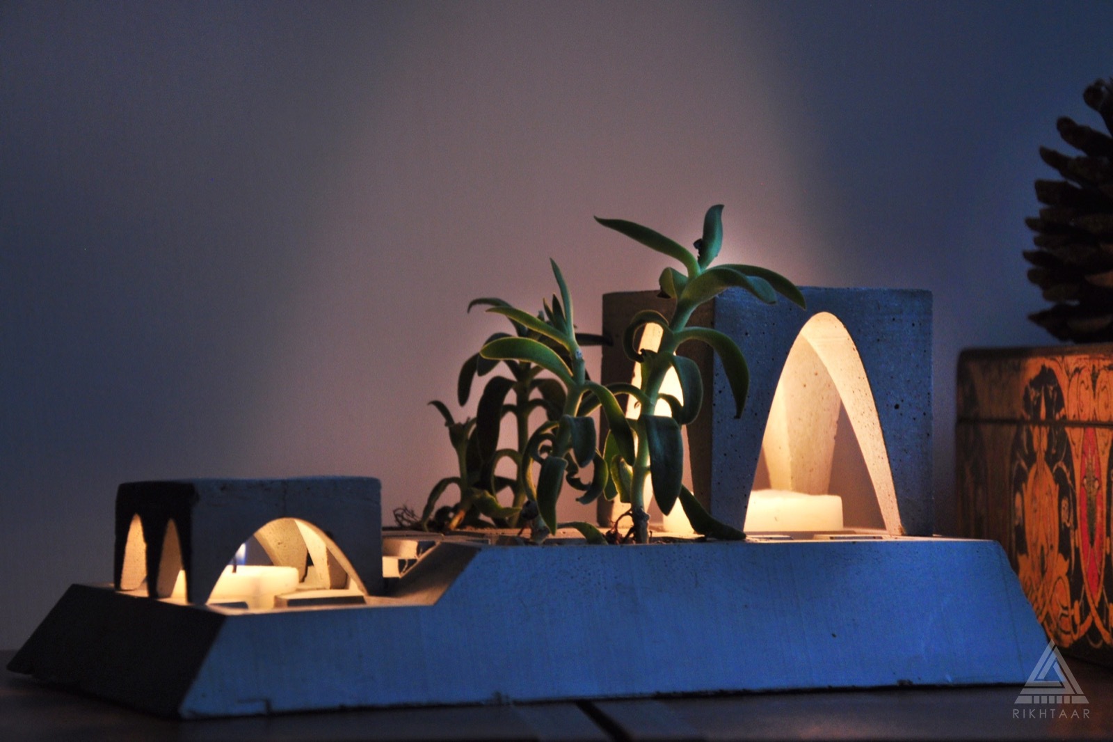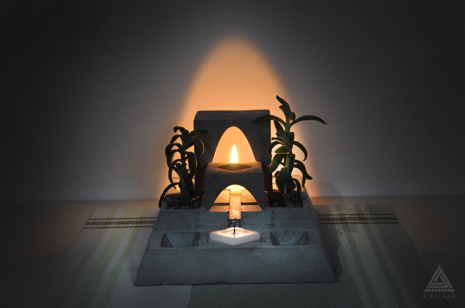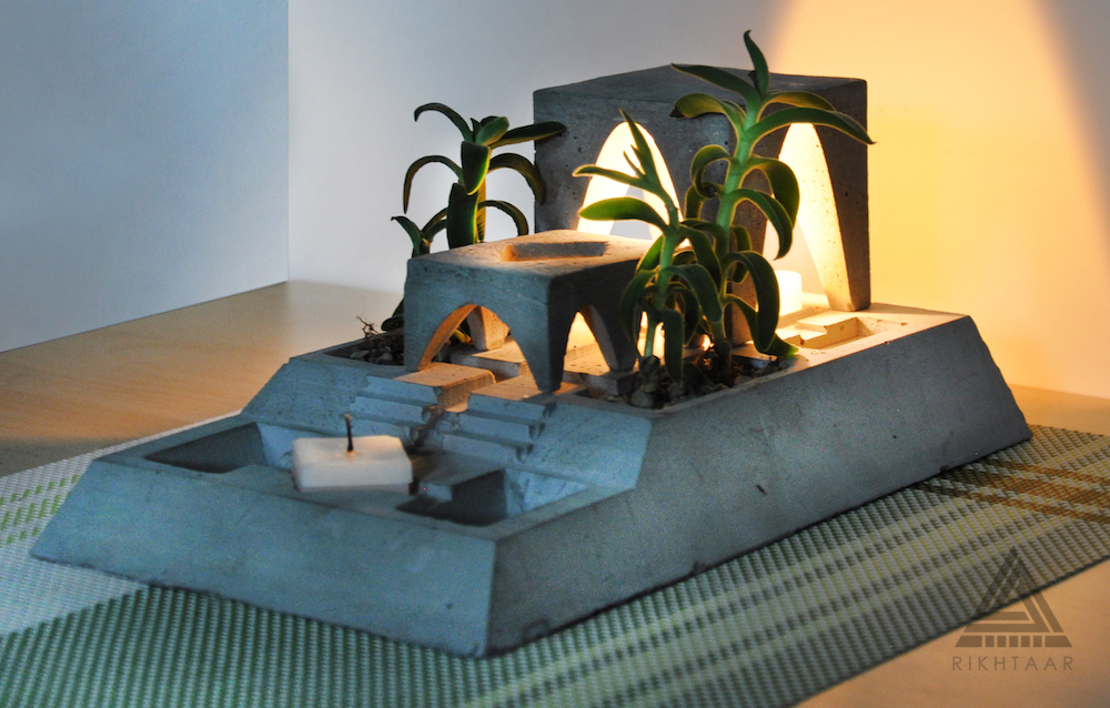 Rikhtaar Second, shaped like a Persian quadrilateral garden, is a composition of plants, candles, and concrete volumes. Perhaps somewhere next to our desk, a simple fantasy of the sacred enclosure concept, with two miniature gardens, might give everyday life a special flavor. If you have the patience and light the candle under the four-arch structure with a match strike, perhaps in the scale of this fantasy in the corner of your work desk, there will be a green presence and light of life…
